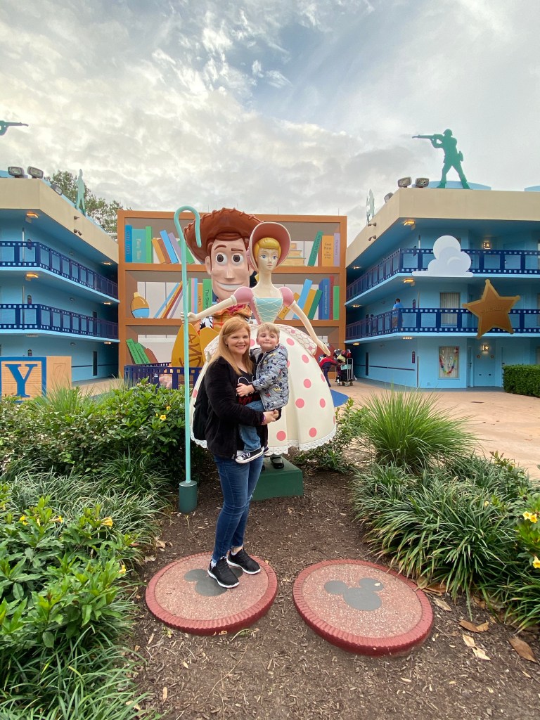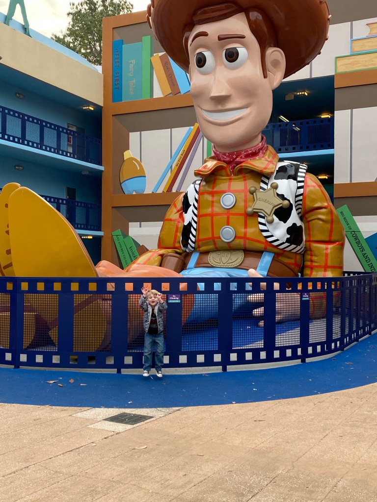 We made it to our resort, All Star Movies, about 3:30. We checked in and got Grant and James first Trip buttons and me a birthday button. I got so many Happy Birthday wishes with that button. After getting checked in we went to our room. We had a preferred room in the Fantasia building very very close to the pool and the food court. We dropped our bags, checked out our room, and headed out to explore the resort a little bit. Our first stop was the Toy Story Building. We were hoping to get to stay in this building but it worked out better being in the Fantasia section anyway. The Toy Story section had a kid size RC Car in the entry way followed by a door to Andy’s room that was so big it made you feel like a toy. There was also a larger than life Buzz Lightyear, Woody, Bo Peep, Rex, toy soldiers and their bucket for the stair case to the second floor along with huge blocks.