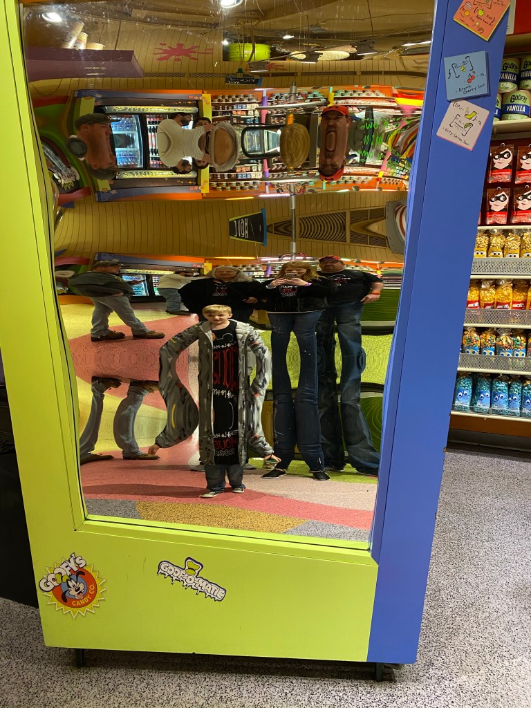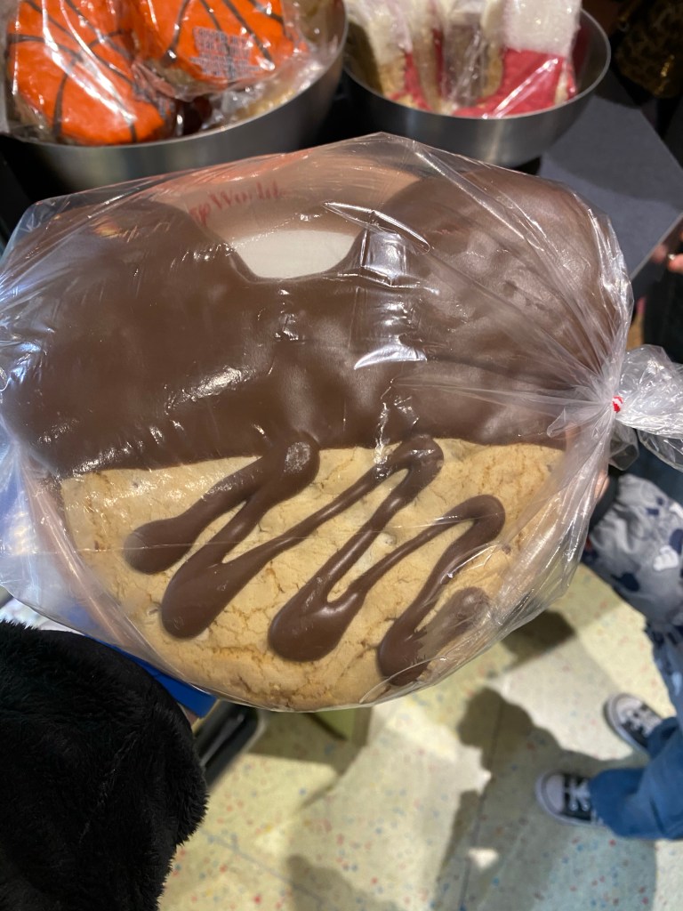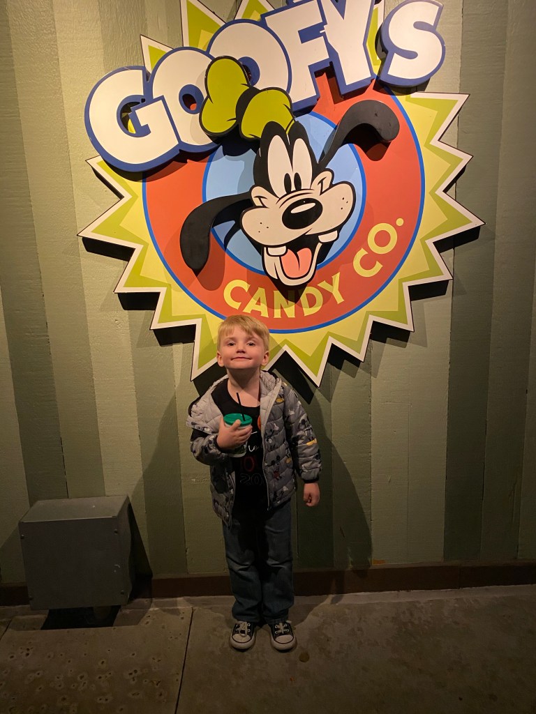 Next we went back to Goofy’s candy shop to finish up spending our snack credits. Grant wanted an olaf sugar cookie and James and I shared a Mickey Mouse chocolate chip cookie. Grant had to check out the fun house mirror again and I grabbed some Mickey Rice Krispies and trail mix to take home.