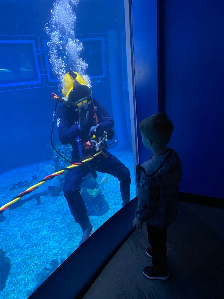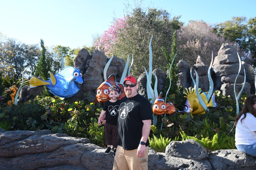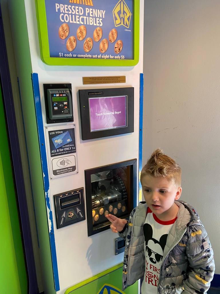 Once the rope dropped, we headed straight to our first fast pass ride: The Seas with Nemo and Friends. We got a little turned around trying to find it but eventually made our way there. This ride was a perfect first ride for my little guy! Grant got a kick out of telling the “mine mine mine” screaming seagulls to hush. Disney’s theming skills are so spot on! We rode through the scenes of Finding Nemo in cute little coral reef styled cars. After this, we looked around the aquarium for a little while and Grant played through the glass with the scuba diver cleaning one of the tanks. Side note: aquariums are my very favorite places to explore! They are so calming! So it was perfect that it was one of the first things we did at Disney. Penny presses were also made in the gift shop.