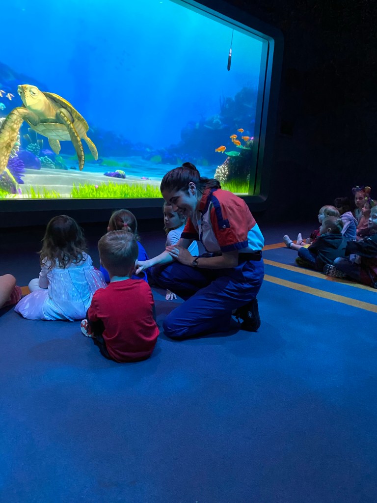 After this we were able to walk on for Turtle Talk with Crush. While waiting in the que, we enjoyed watching sting rays in the tank. One even took a selfie with us. The show was super cute! Grant was the first kid Crush talked to. He was so sweet talking to him and not scared at all like I thought he would be.