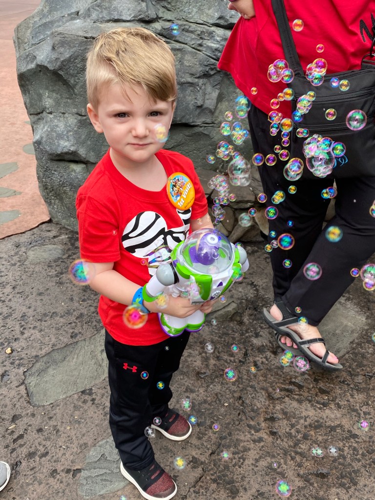 Next up came snack time for James. He got the first of 585000 Mickey pretzels lol. We purchased Grant a Buzz Lightyear bubble wand along the way to our next attraction and this provided so many smiles for him while we waited in lines.