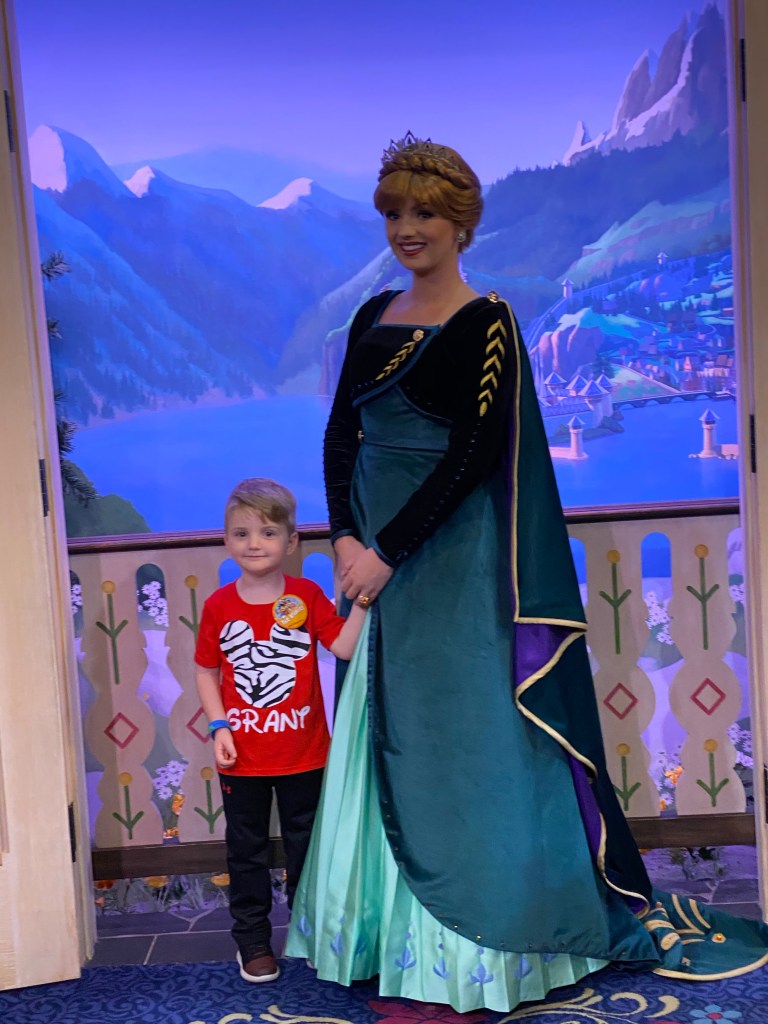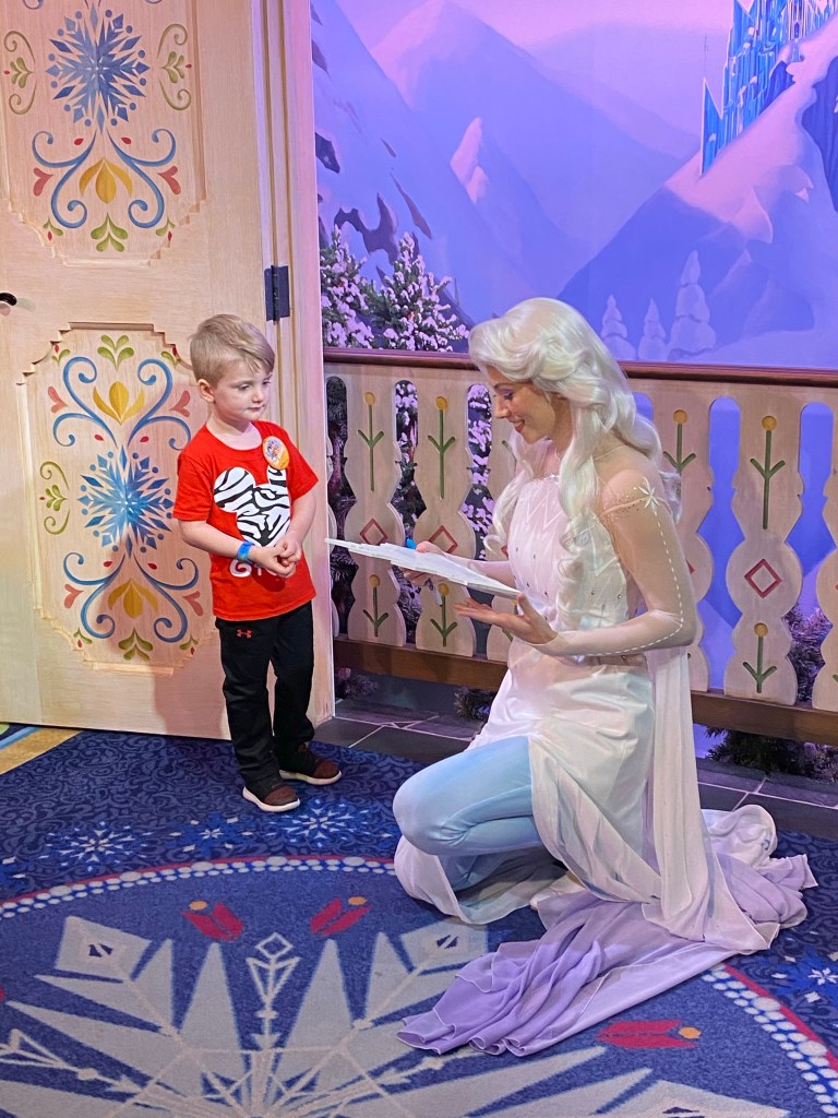We walked to the World Showcase section of Epcot and got in line in Norway to meet Elsa and Anna which was at the top of Grants bucket list for this trip. We waited about 35 minutes for this meet and greet which I didn’t think was bad at all. We found the nicest people in front of us in line to chat with while we waited. They had a 4 year old little girl who Grant shared his bubbles with. Best purchase ever! Once we got in to the Royal Summerhaus and saw the princess and queen Grant was so so star struck. It was so cute to watch him meet some of his favorite characters and be so in awe of them. Again I am thankful for our memory maker photo pass. Anna asked him if he would help give Sven a bath and when he declined she charged him with helping Kristoff with his ice business. Grant agreed he could do this job.