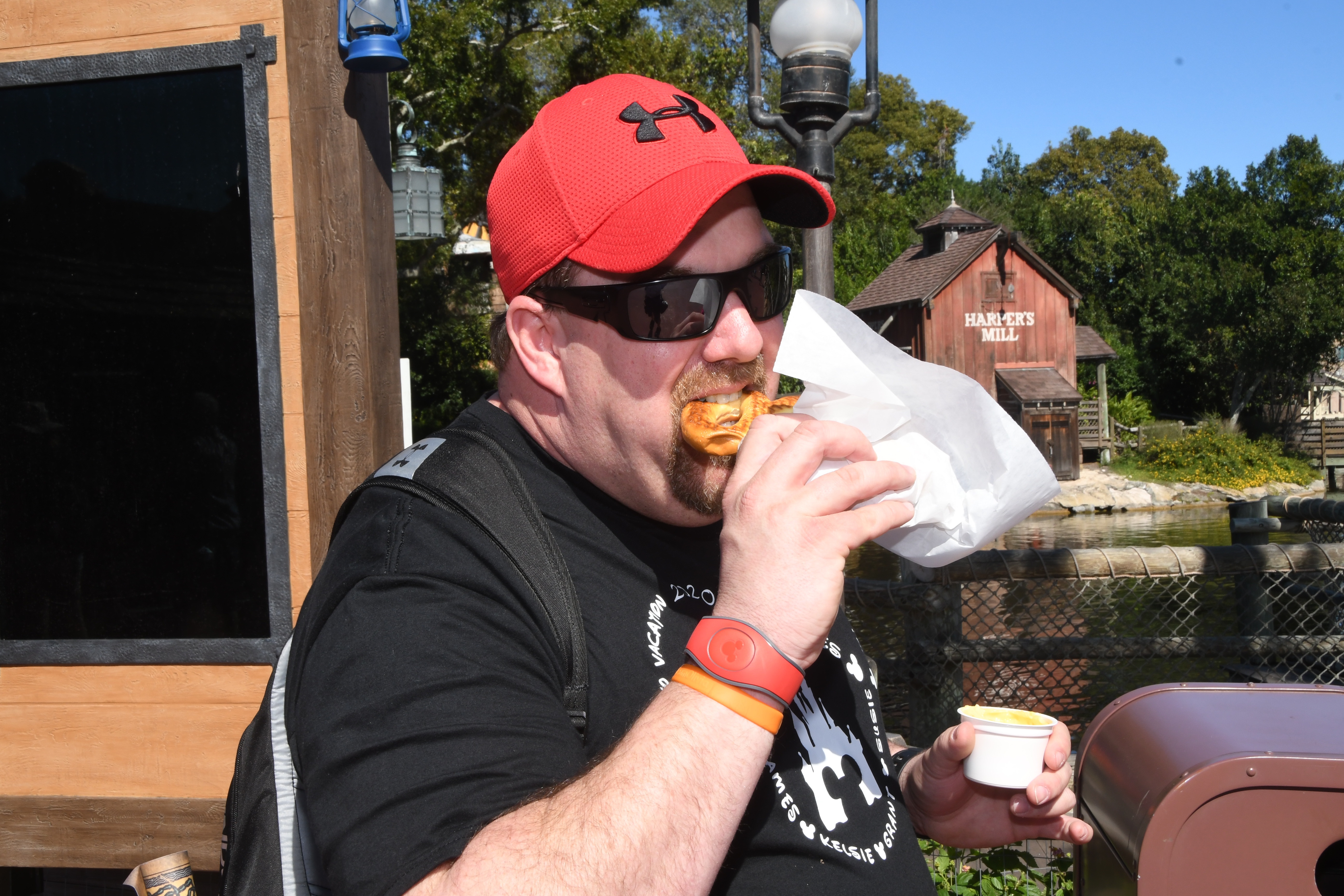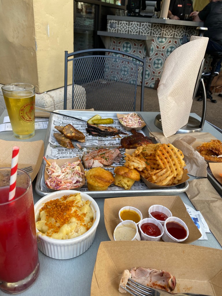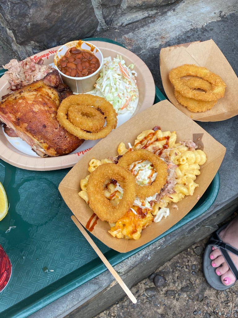 We mobile ordered for the first time! Such a nice perk to the Disney app!! We didn’t wait in any long lines. You order from the app and tell them when you are at the restaurant. They prepare the food and you pick up from a different mobile ordering pick up line. Best thing ever!!! Mom, James, and I ordered from Flame Tree BBQ. Mom got the Pulled Pork Sandwich and onion rings, James got the ribs and chicken combo and I ordered the baked Mac and cheese with pulled pork. I tried to remember to take pictures of all our food but I didn’t do so hot at this. Grant wouldn’t eat anything off this menu, so I trekked to the pizzafari while mom waited on our food and got him another pepperoni pizza which he scarfed down. Mom lost half of her sandwich to some very persistent and not scared at all birds lol! She wasn’t offering it, but he sure took it! This was some amazing bbq and we loved it!