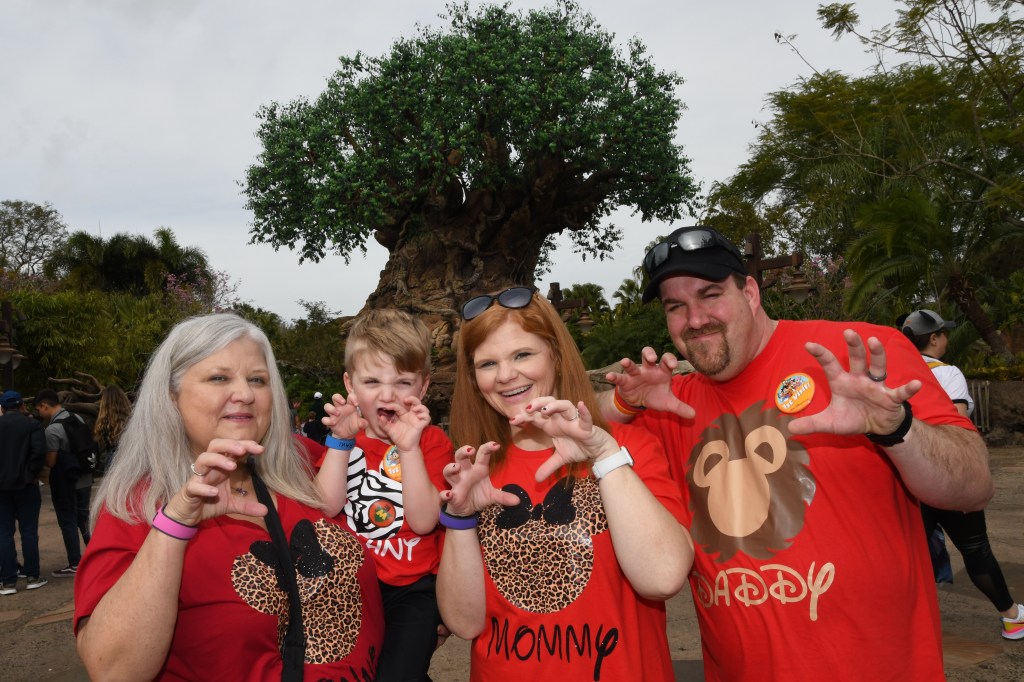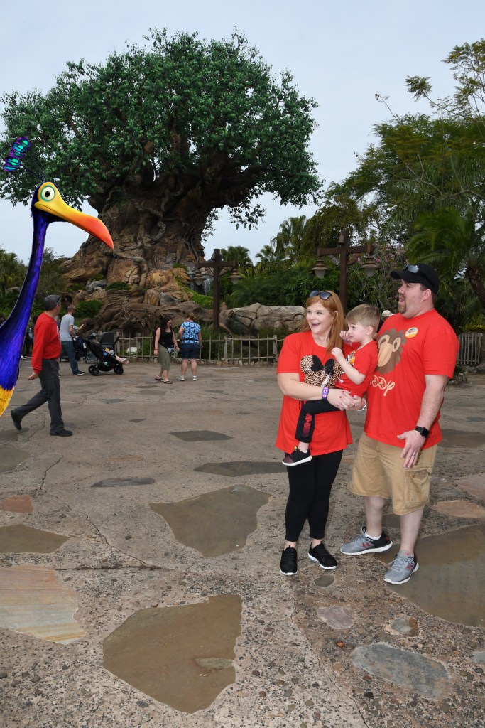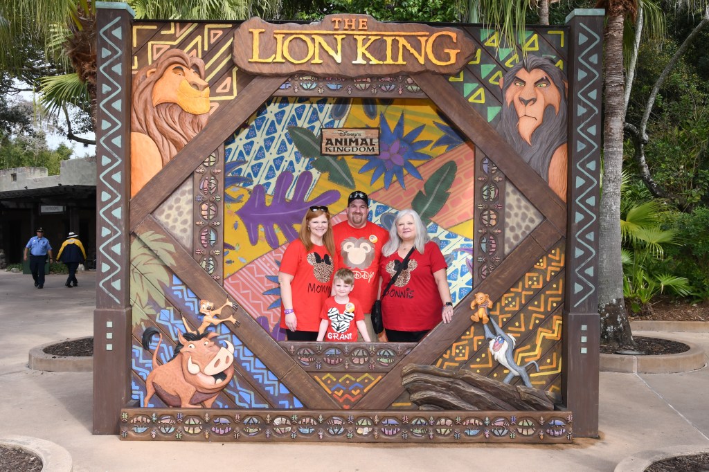 We caught a bus and rested for a little while on the way to Animal Kingdom. When we got there we had to go through bag check and ticket lines again but before we went in we found a memory maker with a lion king back drop so I knew we had to stop.