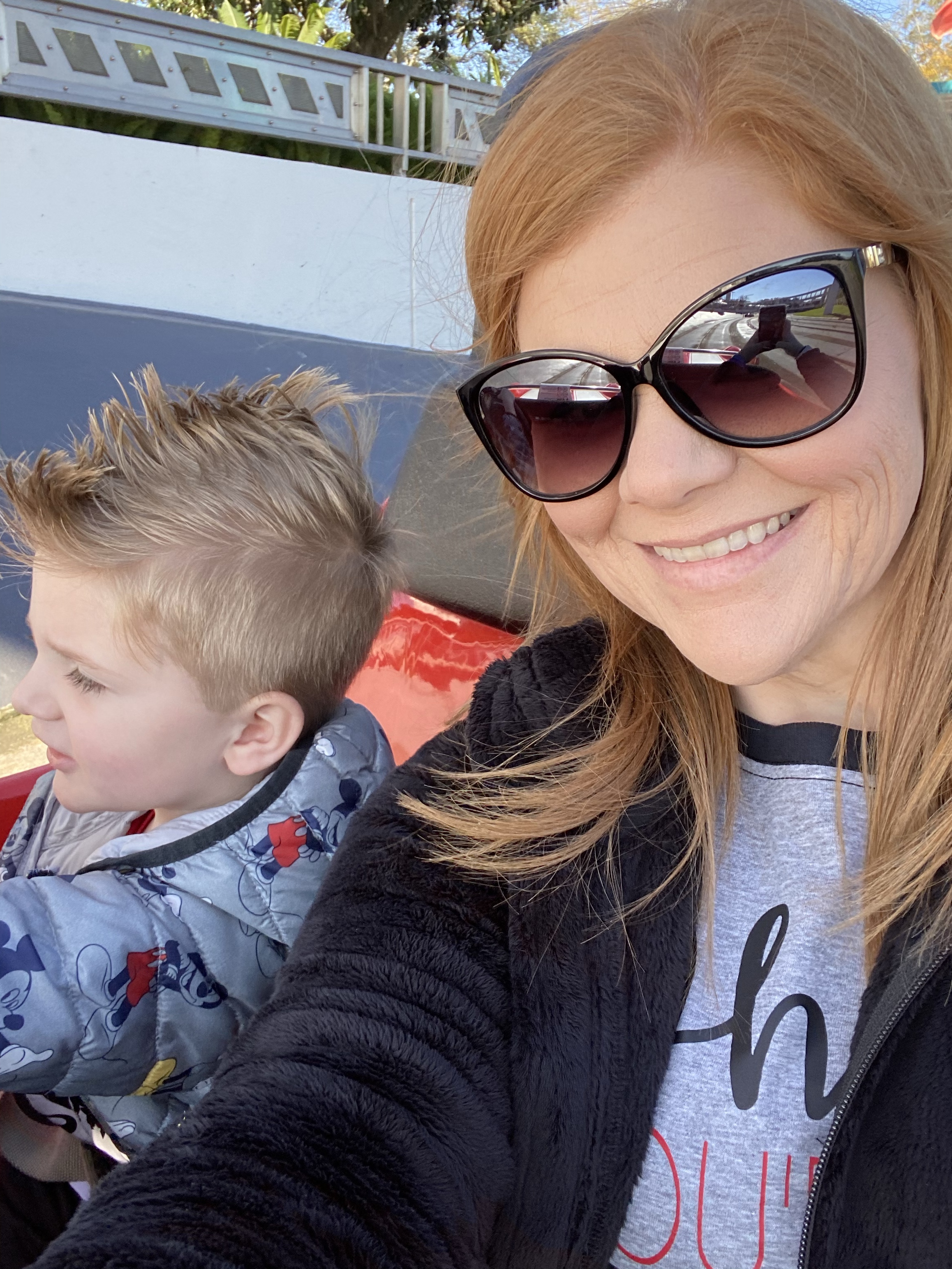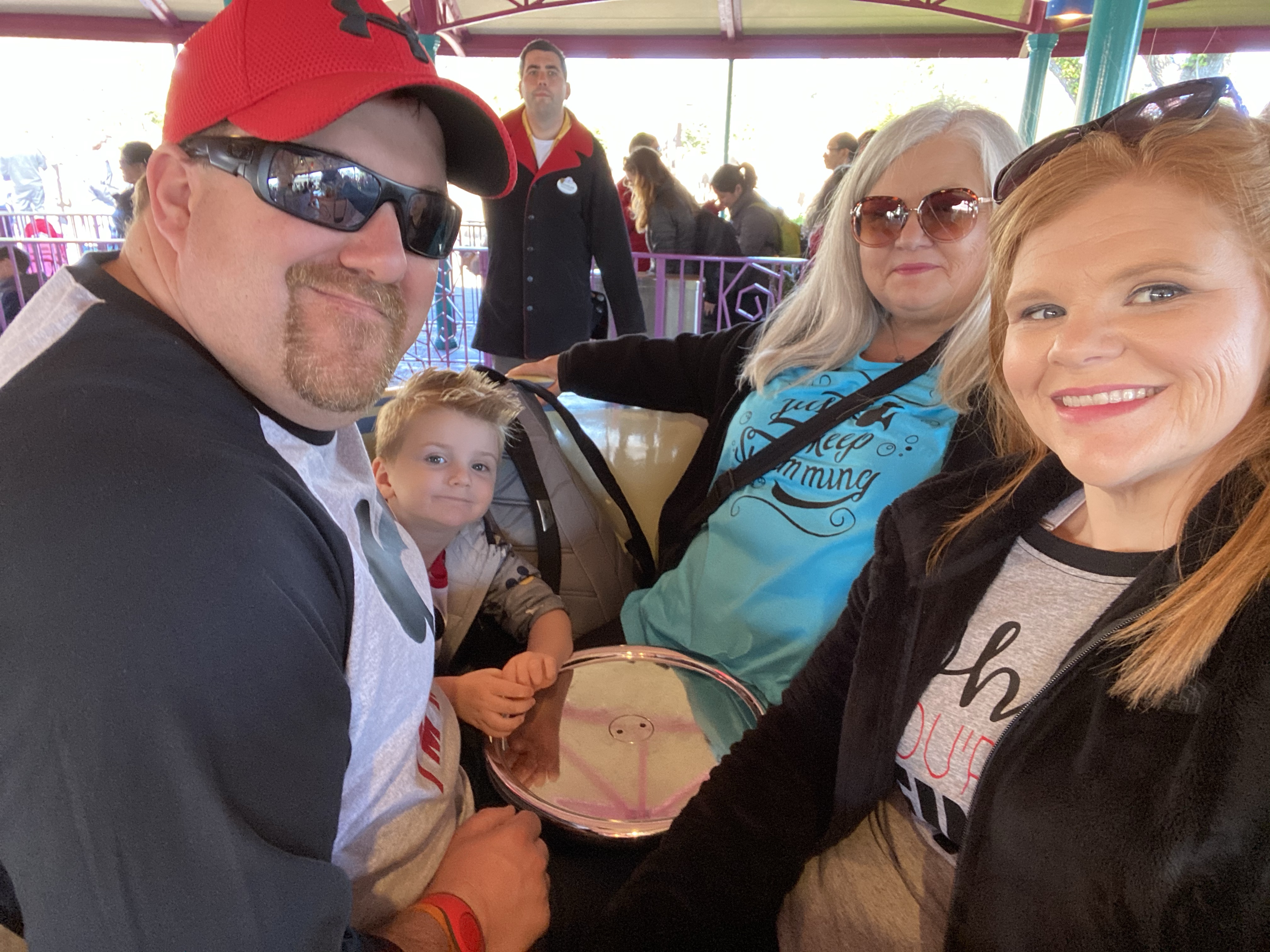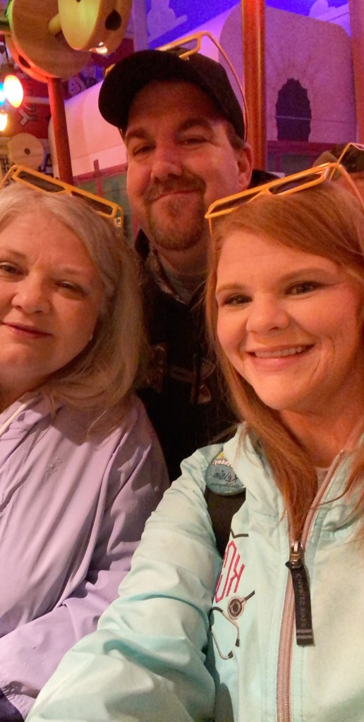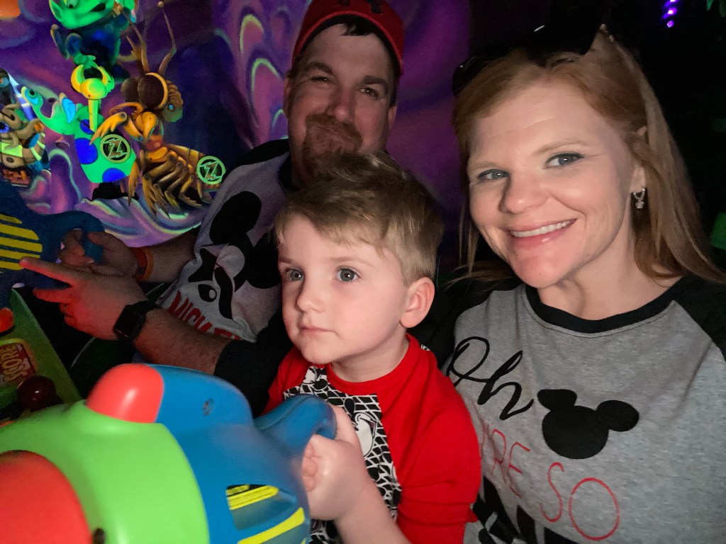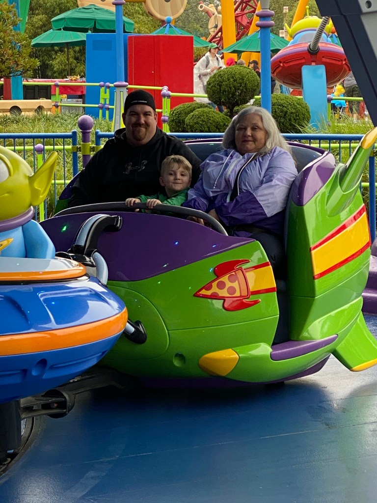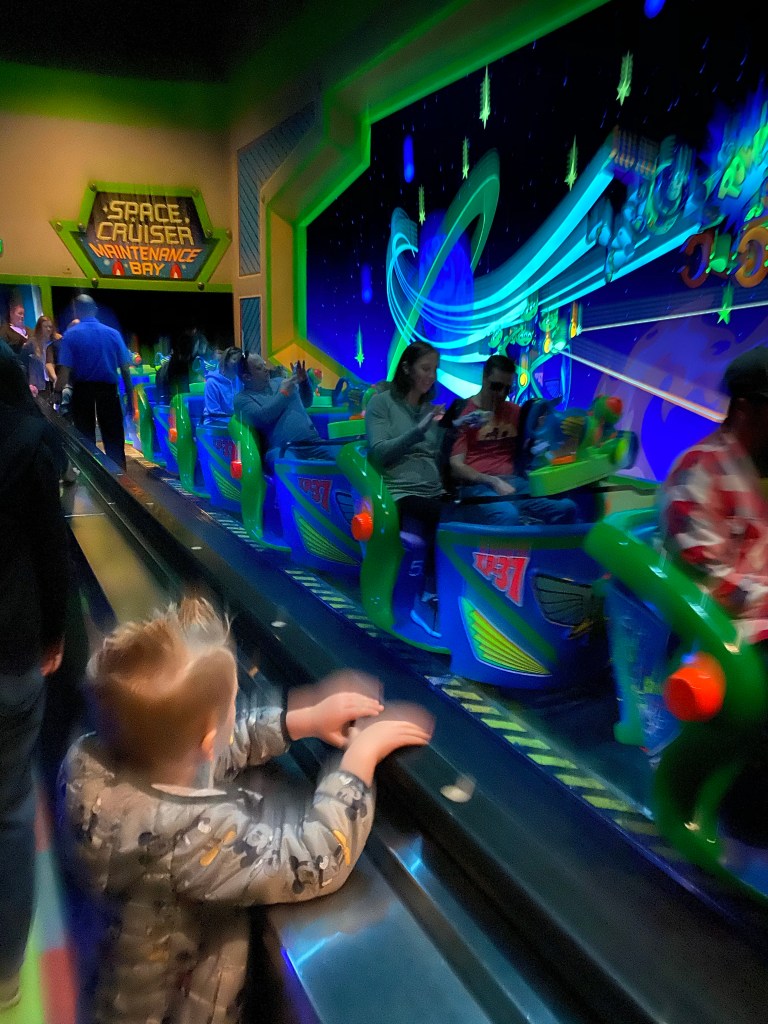 After we got off this ride, James called me and told me they were in line for Alien Swirling Saucers again. He knew how upset I was that I missed riding it with Grant the first time so he made sure we rode it again. I left the stroller with mom and literally ran as fast as I could from Sunset Boulevard to Toy Story Land. Boy did I get some weird looks lol. I made it just in time to (shhh) hop the line and make it to the last loop before they got on the ride. It was so much fun to ride this ride with both of my boys especially after I had to miss it the first time.