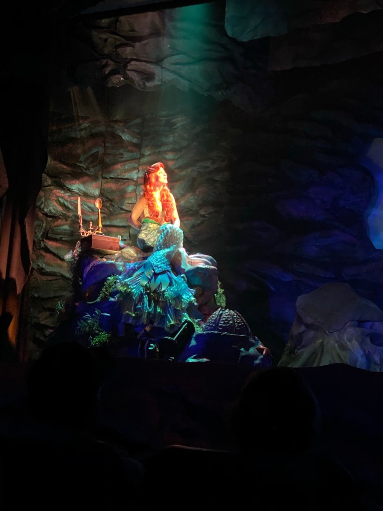 Then it was time for our next fast pass: The Voyage of the Little Mermaid. This was a great show that Grant loved. I might be pretty partial to it too! and it was inside out of the cold rain.