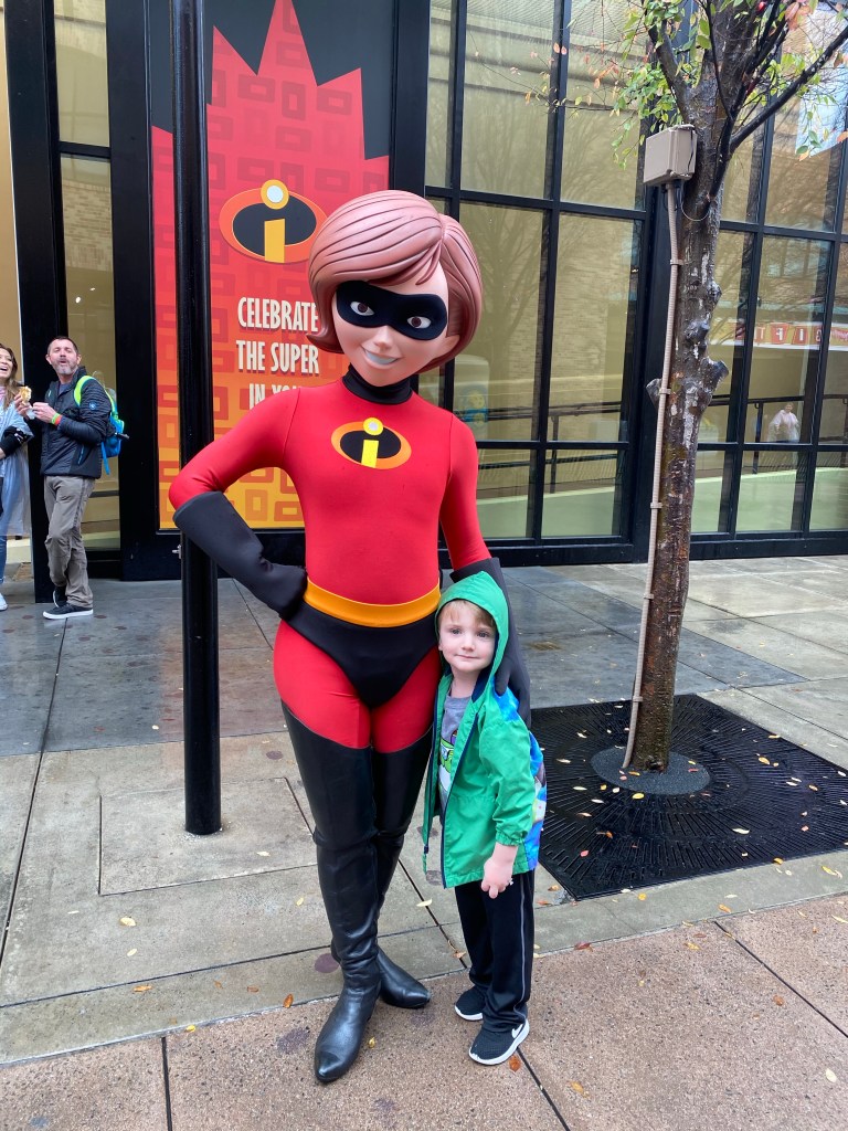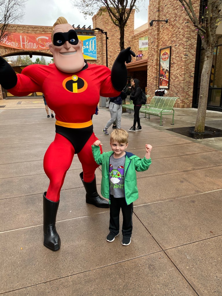 After this we passed back by Incredible Celebration Area and Mr Incredible had made it back from fighting crime so Grant got to meet him and take pictures flexing their muscles. Mr Incredible has nothing on my boy!