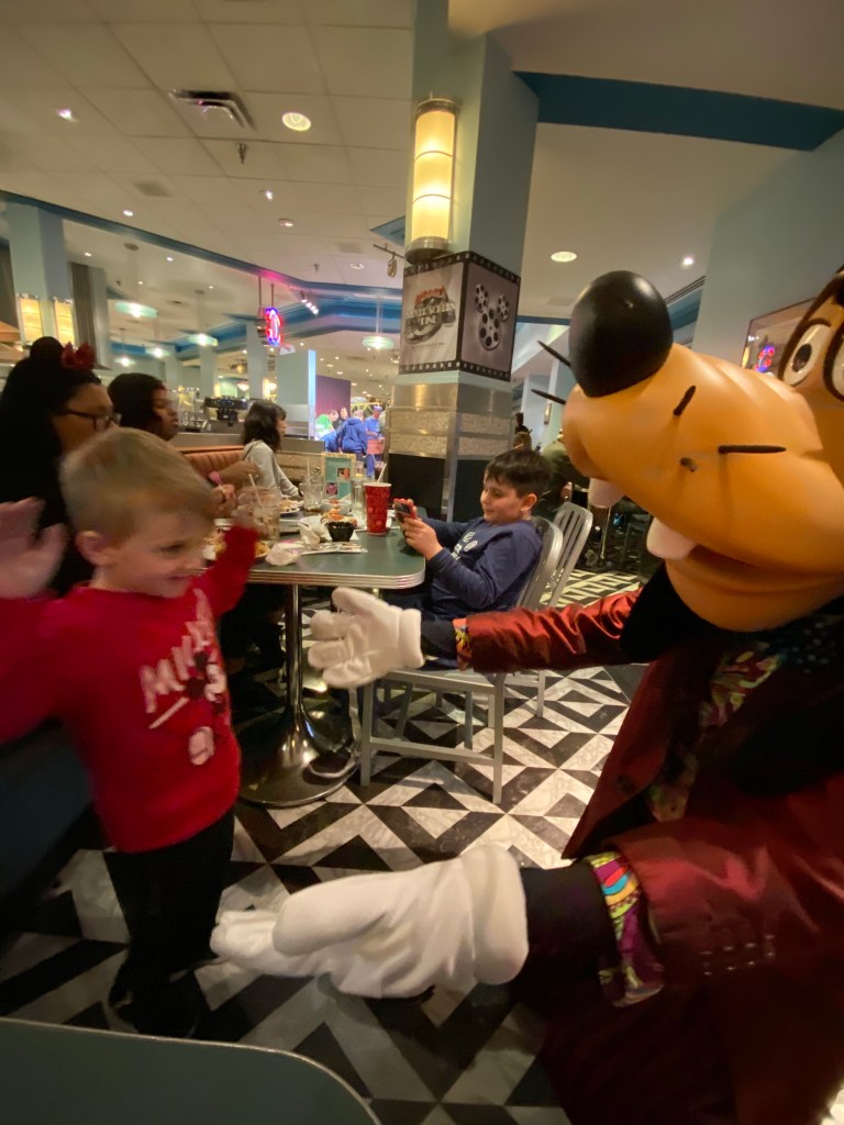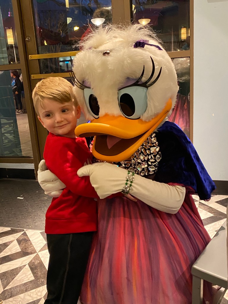 After this show Grant fell asleep in his stroller and and on me when I had to take him out to get in line for dinner. He slept until it was time to go in at our 2nd character meal: Hollywood and Vine. He got to meet Mickey, Minnie, Goofy, Daisy and Donald again but this time they were dressed up in their very best outfits. This was a buffet style meal again with lots of different choices. Including the best cheesecake dessert and Grant enjoyed soft serve Ice Cream with sprinkles.