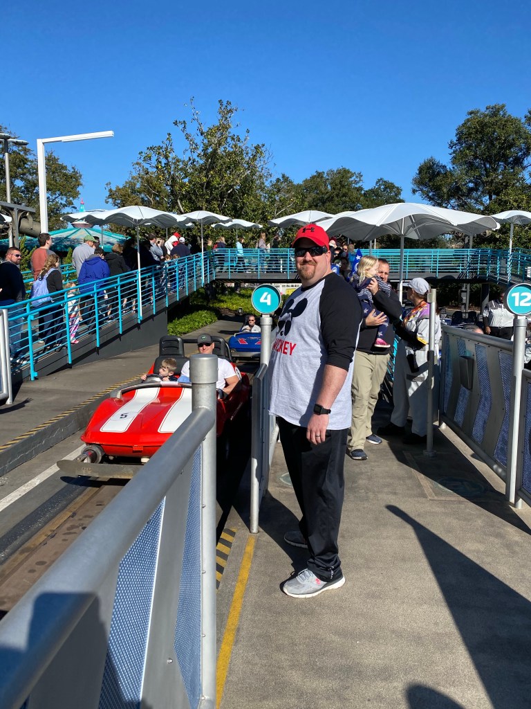 Next up we stayed in tomorrow land and got in line for our next fast pass: Tomorrowland Speedway. Grant and I rode together and James rode behind us. Mom decided to sit this one out. We got in a car that had the steering wheel on the right side and the pedal on the left. I operated the pedal while Grant took the wheel. The car was on a track but he didn’t mind one bit.