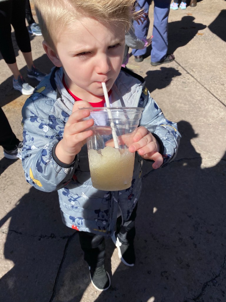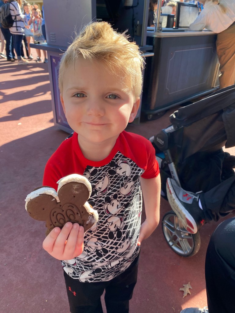 Mickey Ice cream was our next snack. Man did we have a ton of snacks. We had the middle dining plan that came with 40 snack credits for the 4 of us to share in 5 days! I am not typically a snacker so this was hard to remember to stop and try things. Grant wanted a Mickey Sandwich and James and I shared a chocolate dipped Mickey head.