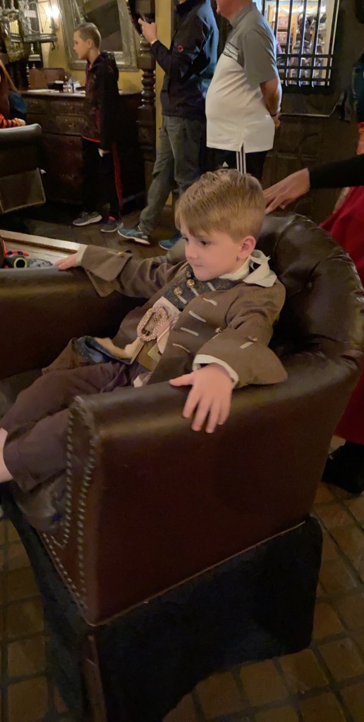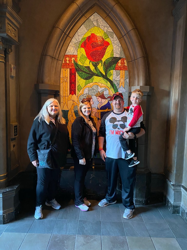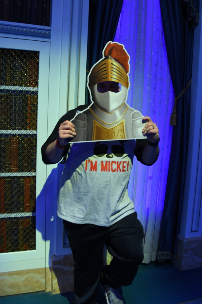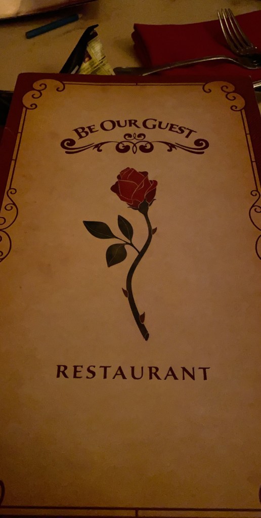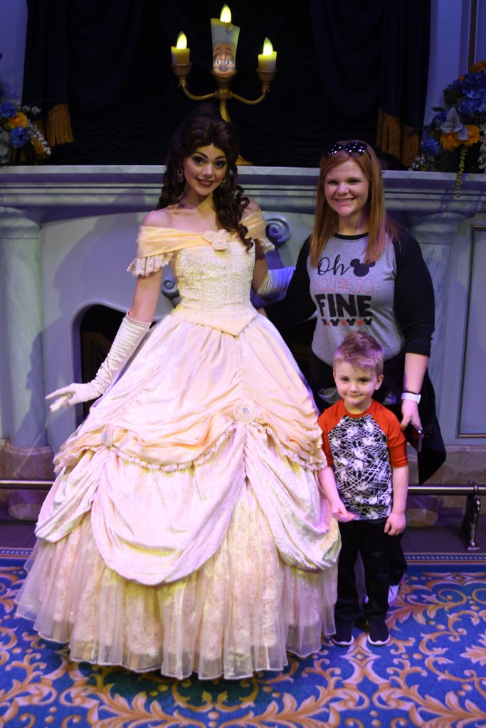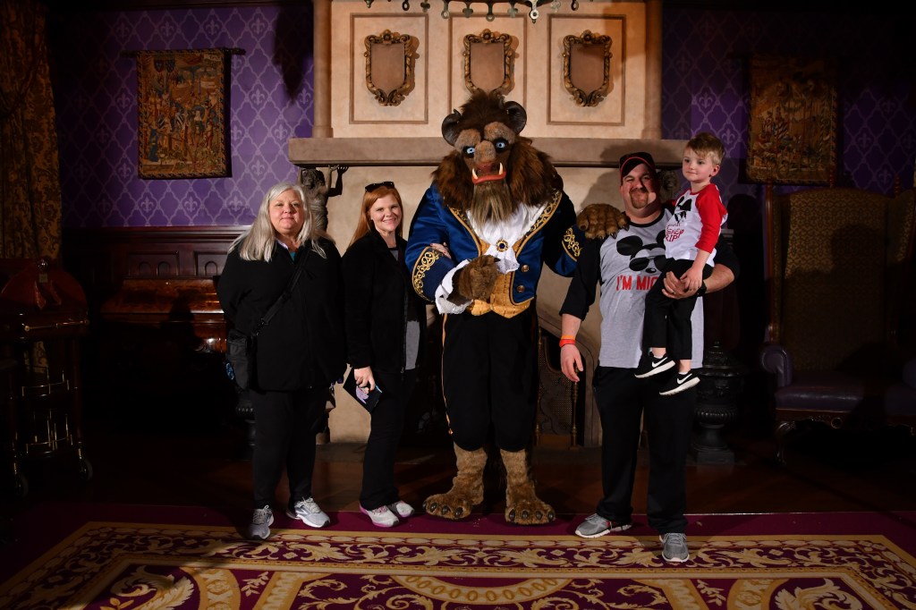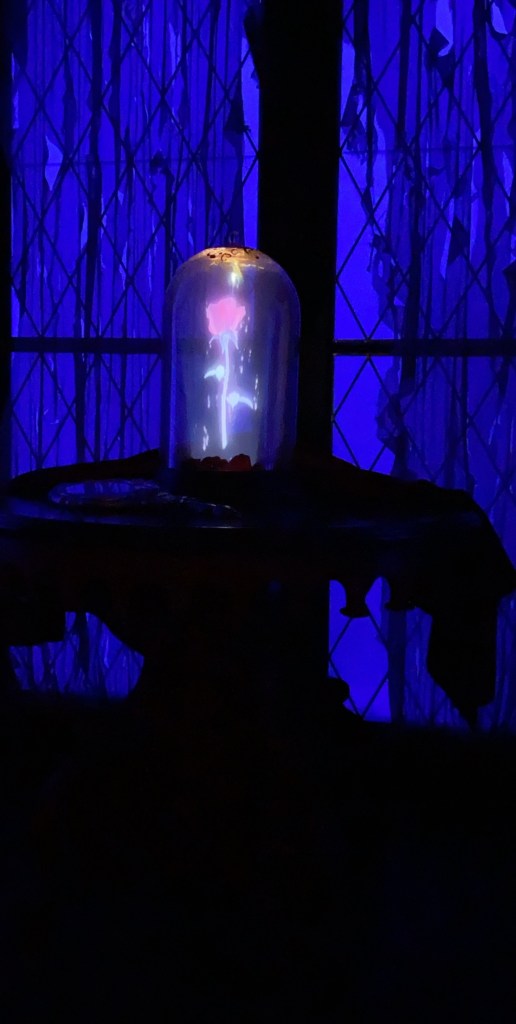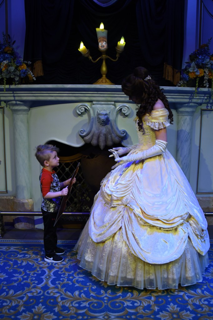 After finishing up with this fabulous dinner and grant waking up, we walked to the West wing to see the rose! We initially had requested to be seated here but we were glad We declined the 45 minute wait because it was so dark in that room! After seeing the rose, we made our way to the study to do a meet and greet with the Beast! There was a memory maker here to make sure we got some awesome pictures.
