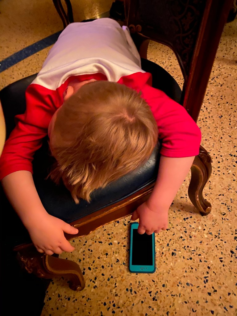 Grant is such a picky eater I knew he wouldn’t eat anything off the menu so we had stopped and got him some chicken nuggets from a quick service restaurant, Cosmic Rays, that he ate on the walk to the restaurant. His belly was full and as soon as he got still at the table he actually passed out face down on the chair with his arms and legs hanging off. He dropped the phone he was watching and when I looked down to pick it up I noticed he was sound asleep. So cute. A very sweet waitress brought over another chair so we could prop his legs up and she covered him up with a napkin. It was so sweet.