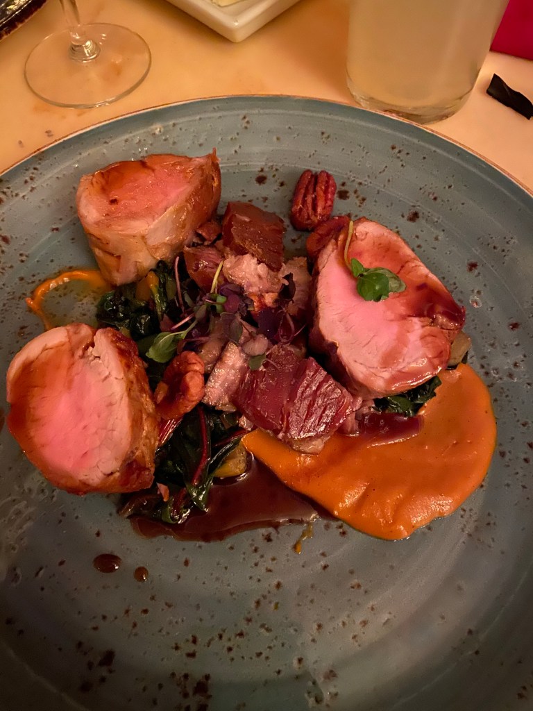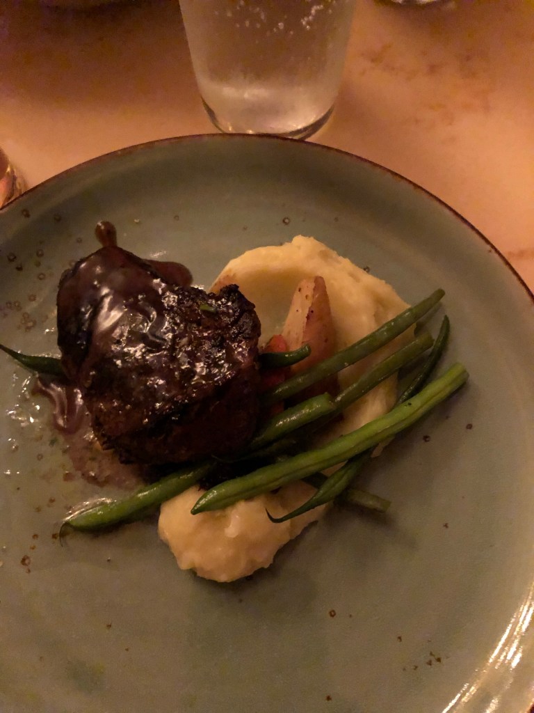 This was hands down my favorite meal of the trip. I ordered the lobster bisque for my appetizer, James got the assorted meats and cheese selection and mom got the mixed field green salad. Next up was the main course. I ordered the herb salted pork tenderloin, James had filet mignon, and Mom got the Poulet Rouge Chicken. Every single one of these dishes were amazing! We didn’t have high expectations for liking this meal but it easily was all of our favorites.