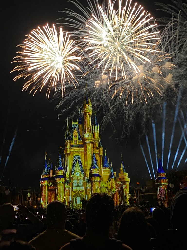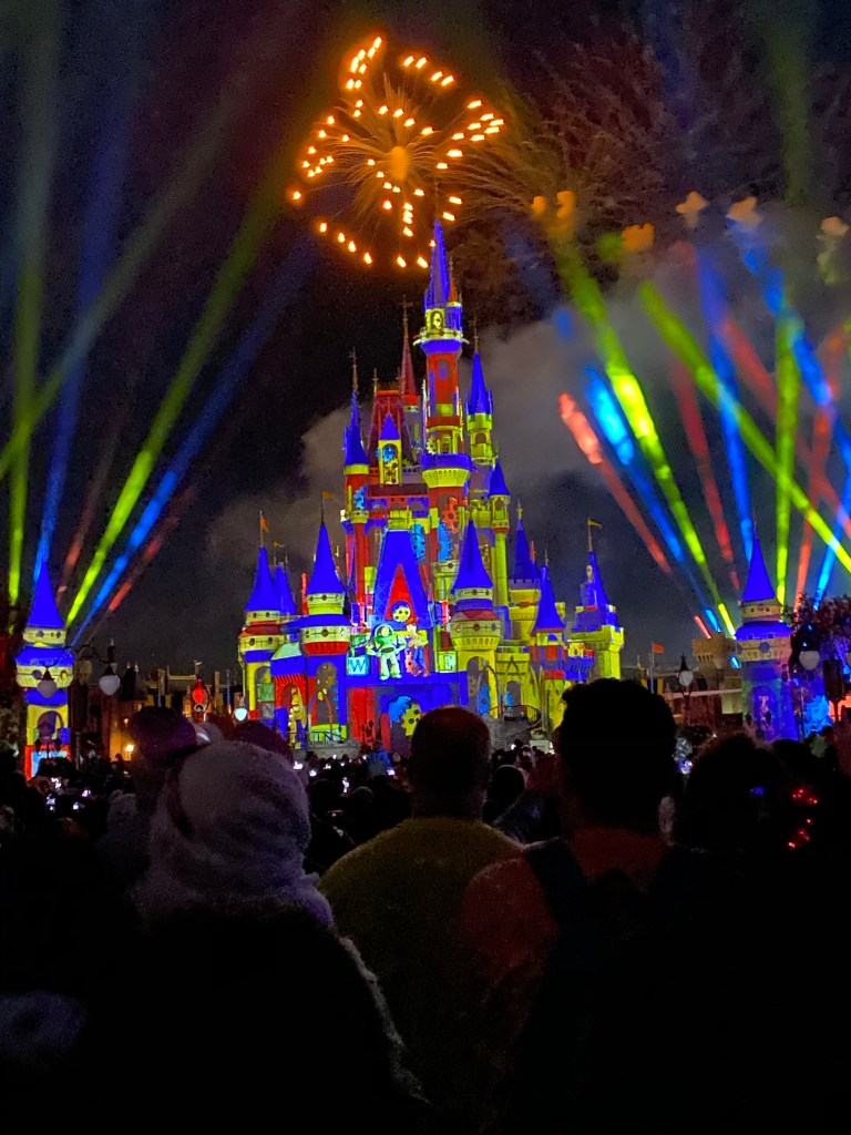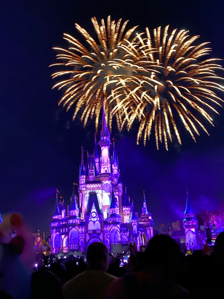 Our dinner reservation was at 5:45 and the fireworks show at the castle started at 8. We had just enough time to fast walk across the park to get a spot to see the show. Disney fireworks are the most amazing show ever. Grant was in awe the whole time and sang along with every song that came on. It made me teary eyed to get to experience this with my family!