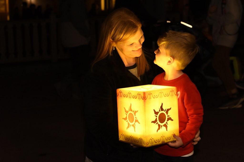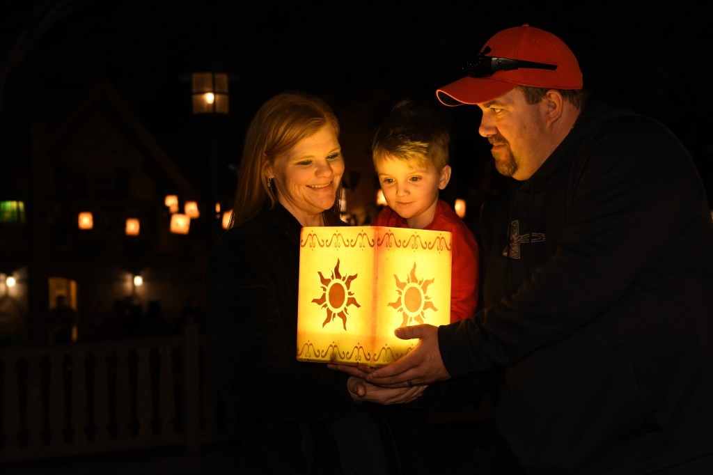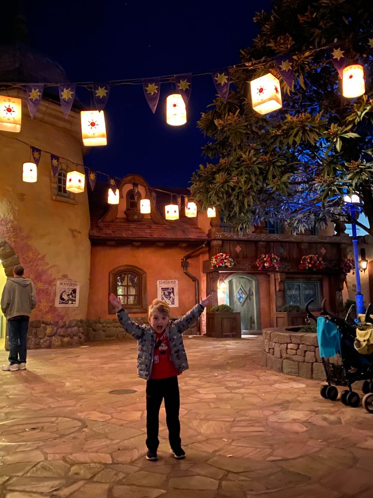 I knew that I had one more must do on my Disney bucket list that I just had to get done. Lantern pictures at Rapunzel’s tower. James, Grant, and I trekked from the castle to the back side of Fantasyland to get to the memory maker before the park closed at 9. I was pleasantly surprised to only be about 5 people back in the line. These are my most favorite pictures from the whole trip. Grant loves Tangled so he was super excited about this too.