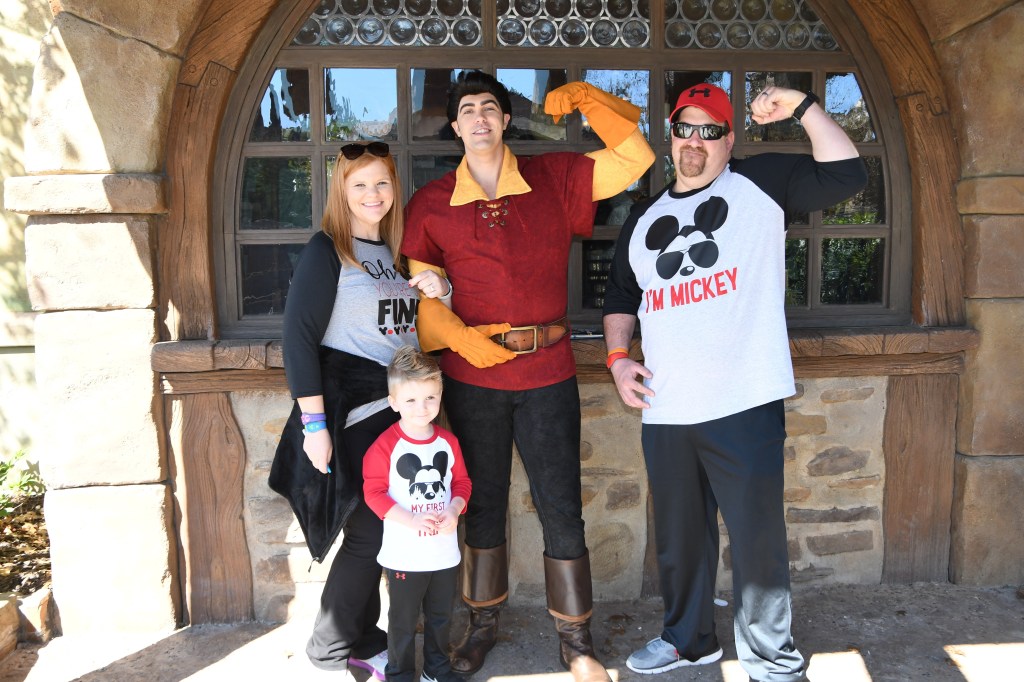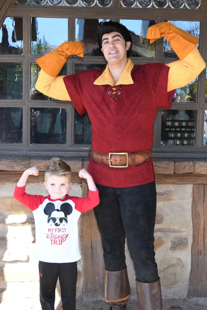 After sitting down to eat this afternoon snack, we started walking to the Journey of the Little Mermaid. But on the way we found Gaston. Beauty and the Beast is my favorite so of course we had to stop. Gaston asked grant about his workout routine and if he could give him some pointers to help win Belle. We all got pictures made and an autograph signed. James had to have a picture flexing with him. While we were doing this experience Mom went on to get in the little mermaid ride. She wound up riding without us and then finding a frozen coke stand and had a snack.