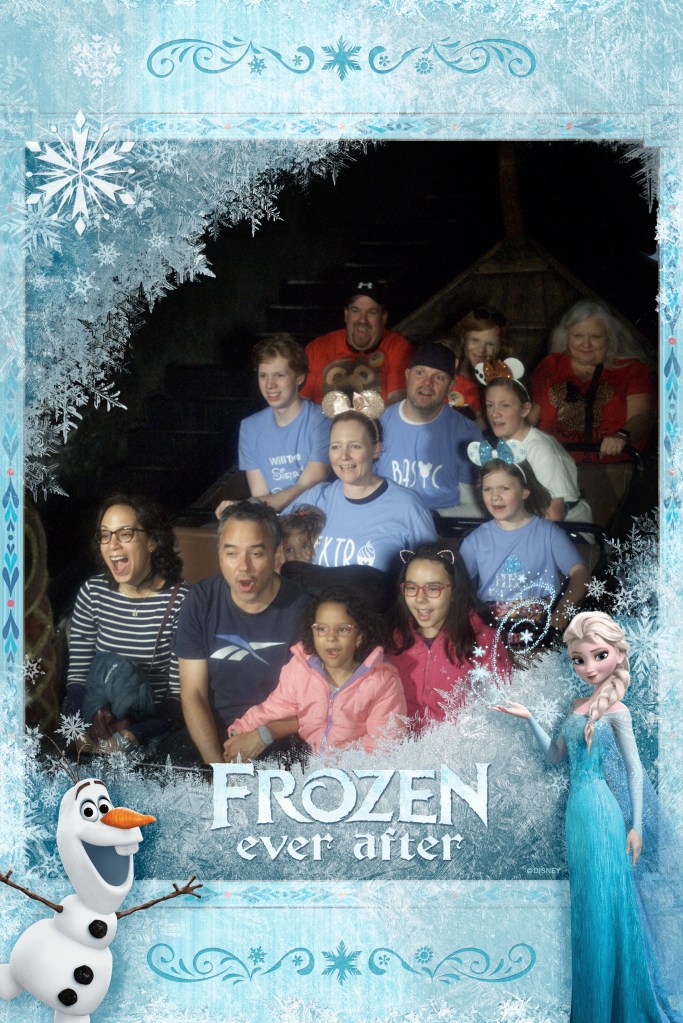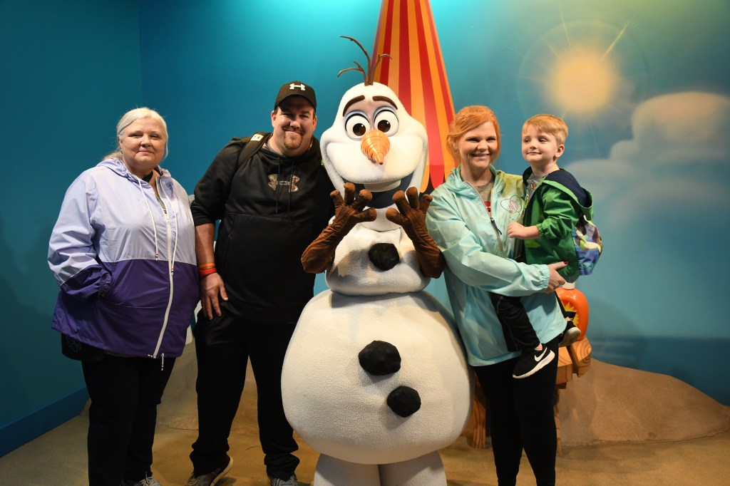 Next up we went to Echo Lake to use our 3rd fast pass of the day at For the First Time in Forever: A Frozen Sing Along Celebration. I LOVED LOVED LOVED this show. Grant was so very happy watching it and literally sang every word of every song! It was a perfect memory for me! And again I was happy we were inside out of the cold rain. Yes I’m a wimp these days. But that didn’t last long because after the show we went outside to wait in the line to see Olaf. This was probably one the longest lines we waited in the entire trip. But Grant really wanted to see Olaf and give him a hug so we did it. It was worth it for all the smiles!