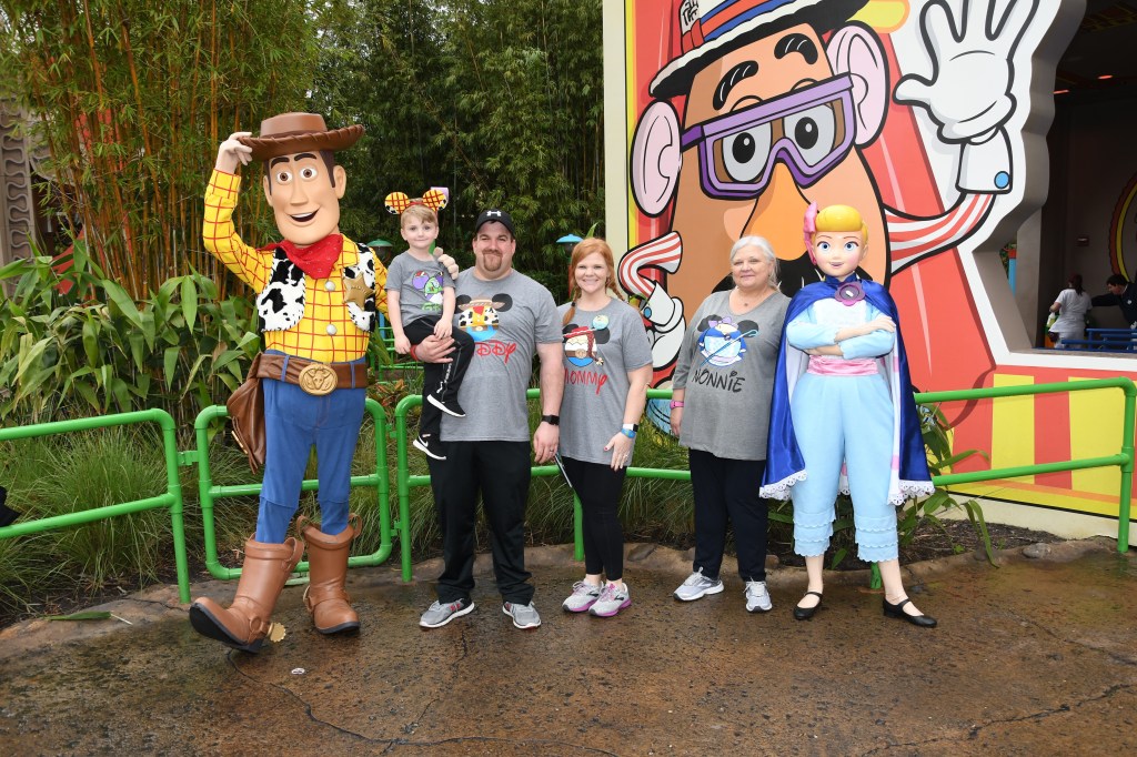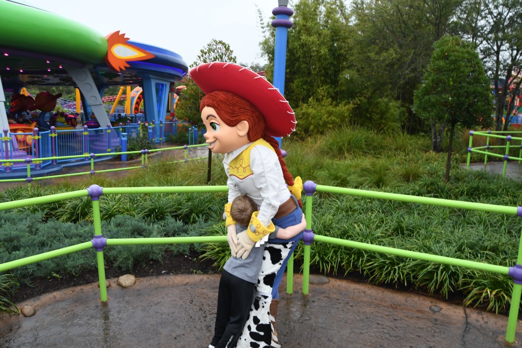 After this ride was over, I noticed a line starting to form so I jumped in it while Mom, James, and Grant were getting off the saucers. It was a meet and greet line for Jessie and it wasn’t long at all. It had stopped raining for a few minutes and they brought the characters out! We all had on Toy Story shirts and Jessie loved them! She pointed out my shirt, which was representing her, and also pointed to my red hair and her red hair. I feel we had a moment!