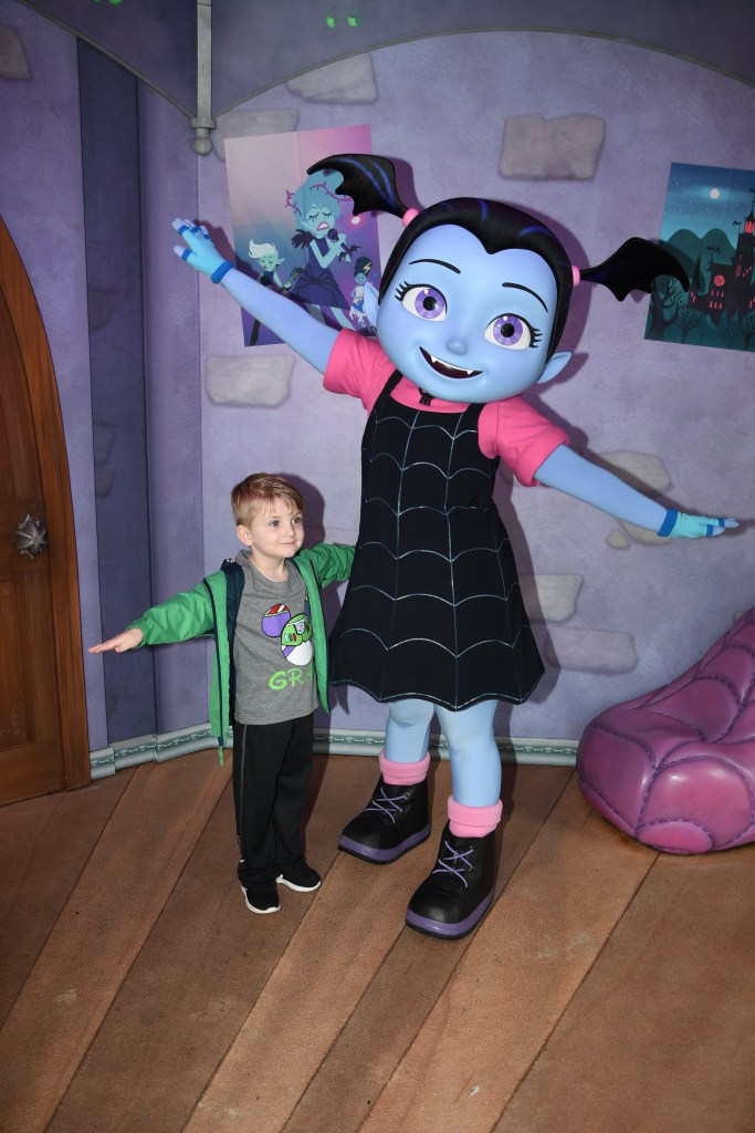After this we made our way back to the Animation Courtyard to pass some time and get out of the rain by doing covered Character meet and Greets with Vampirina and Doc McStuffins. I was wearing a pullover that had a stethoscope around my monogram and Doc went crazy over it. She just pointed and pointed and jumped up and down clapping her hands. It was so cute.