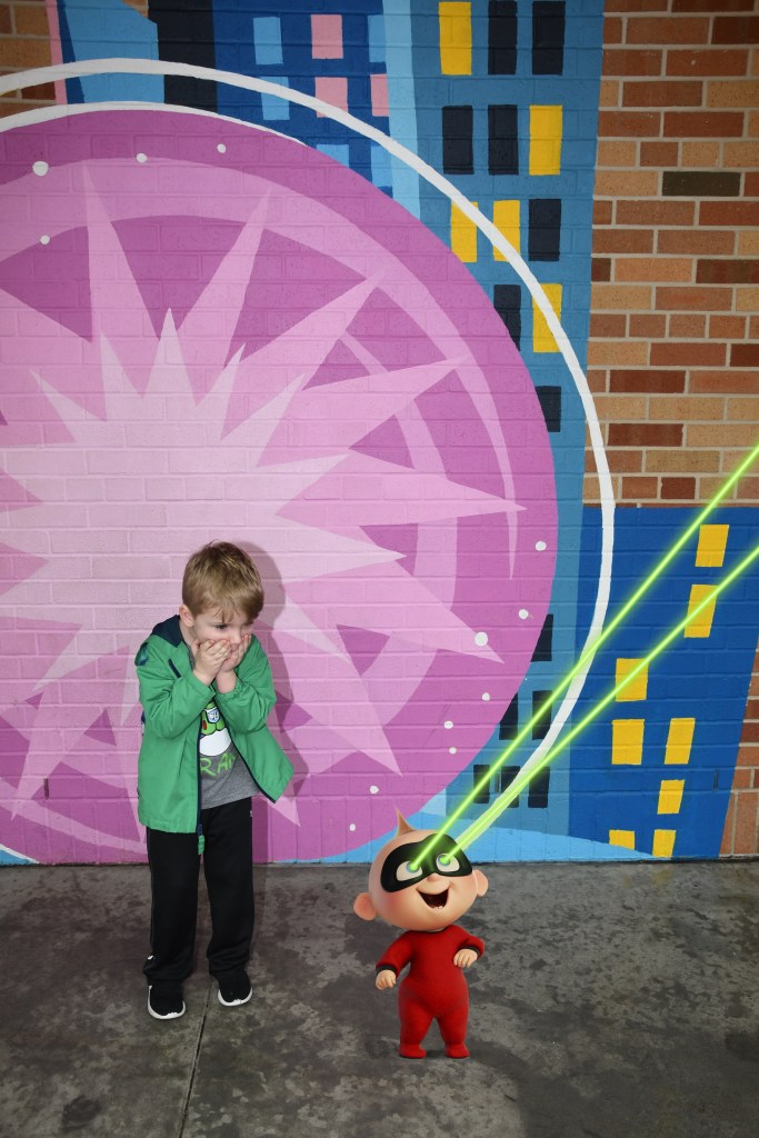 After this show we headed to An Incredible Celebration Area and met Mrs Incredible in the street. Mr Incredible had just got called to a crime fighting emergency so we didn’t get to meet him till later. Momma needed some coffee to warm up since it was still nasty and rainy out and Grant decided he needed a Jack Jack Num Num cookie, yep you guessed it…Another chocolate Chip cookie. My boy does love his cookies! James got yet another Mickey pretzel lol and then we went to the Edna Mode character meet and greet. We also found a memory maker set up in this area too.