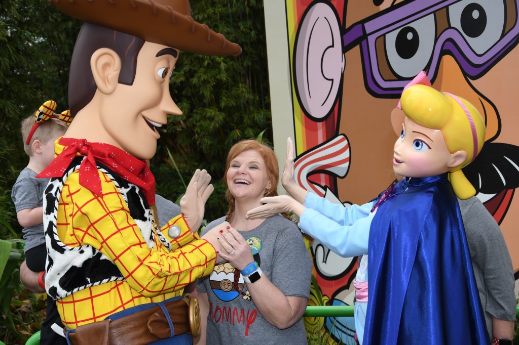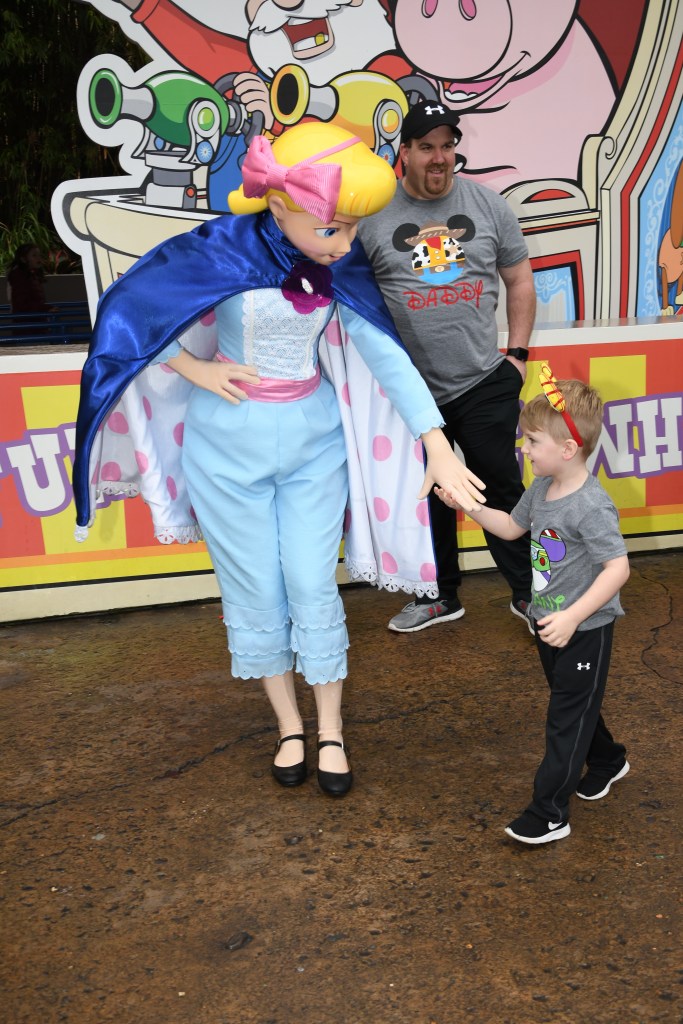 After we got off this ride we stood in line to meet Woody and Bo Peep. While waiting for them, we watched the army man parade. Grant loved meeting Woody and Bo! They both loved our shirts and Woody noticed my birthday button. He asked me if I was 21 and told me my face looked so young. Bo loved moms shirt and buddied up with her!