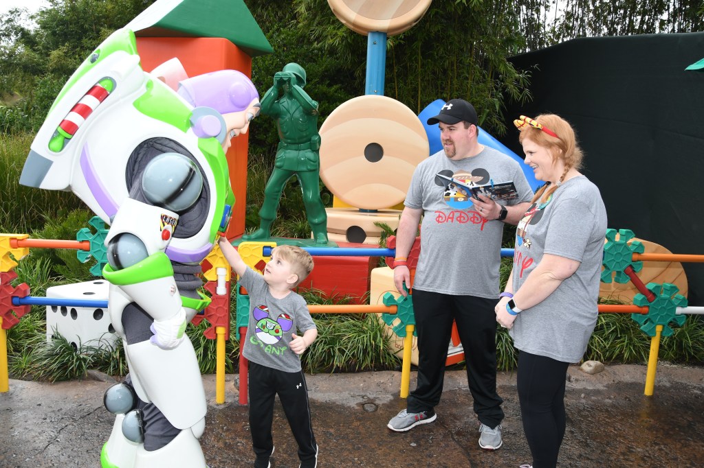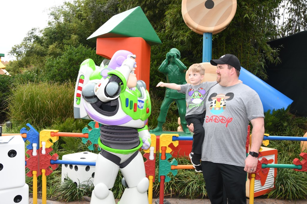 We got in line to meet Buzz next and while we were in line noticed a memory maker in front of the Toy Story Land sign so we left mom in the line and ran down to get some pictures made with the perfect photo prop for my Toy Story loving boy!