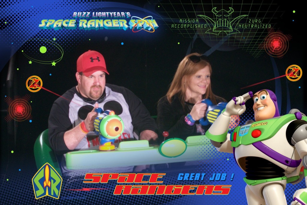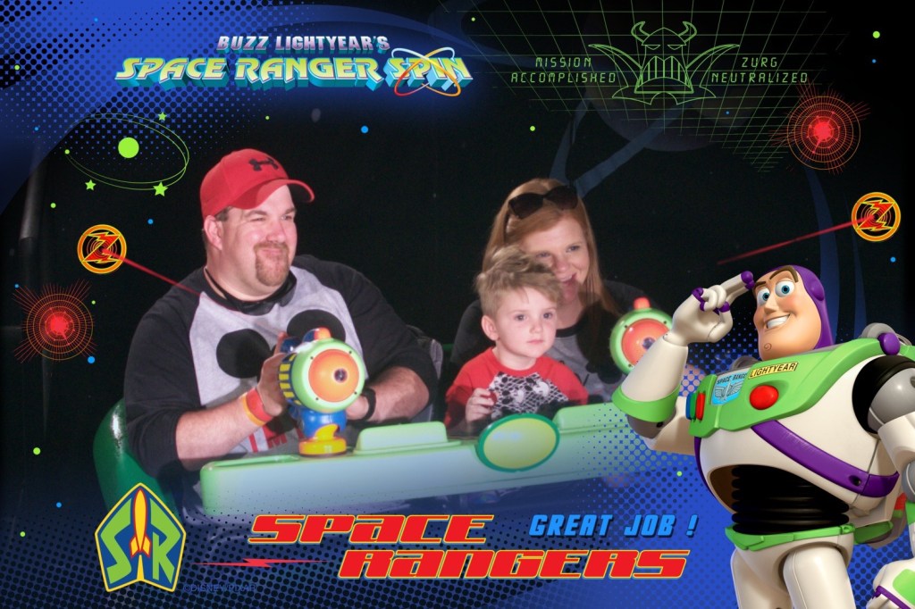 Mom and I were able to score a fast pass to space mountain. So while we headed off to ride that dark but so much fun ride, James and Grant took off to fast pass Dumbo the flying elephant. After space mountain was over I met James and Grant and got In line to ride the space ranger spin again.