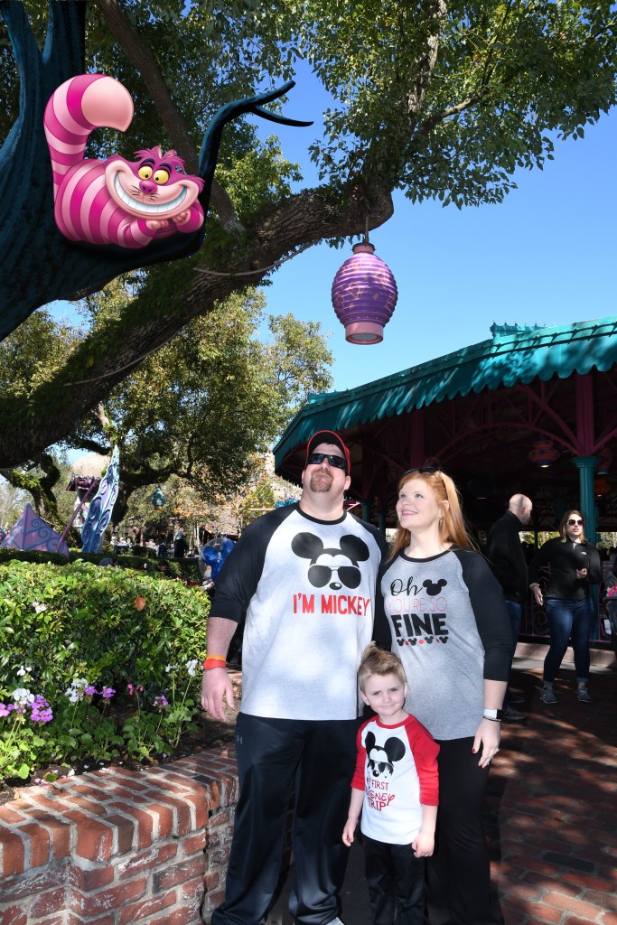Mad Tea Party spinning tea cups were next after Philharmagic. All 4 of us squeezed into one little cup. It was a tight fit but a fun ride! And the smiles and laughs coming from Grant were so precious! After this ride was over we spotted a memory maker and got a couple pictures made in front of the mad tea party sign and one special graphic one with the chesire cat.