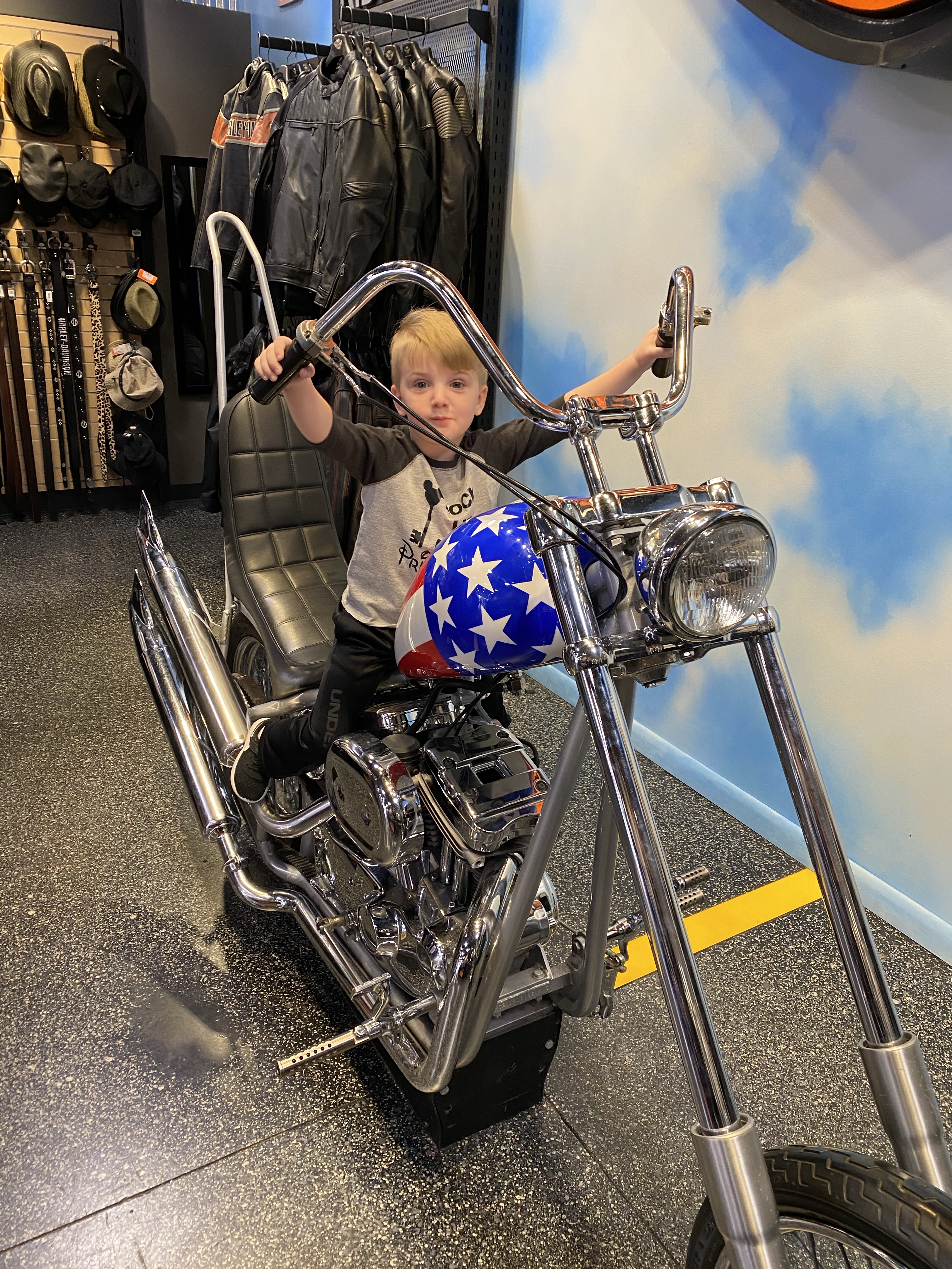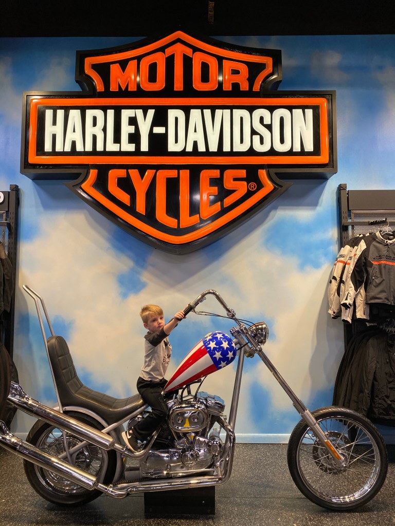 At Disney springs, we visited the Harley Davidson store and Grant had fun sitting on the Harley they had set up for pictures.