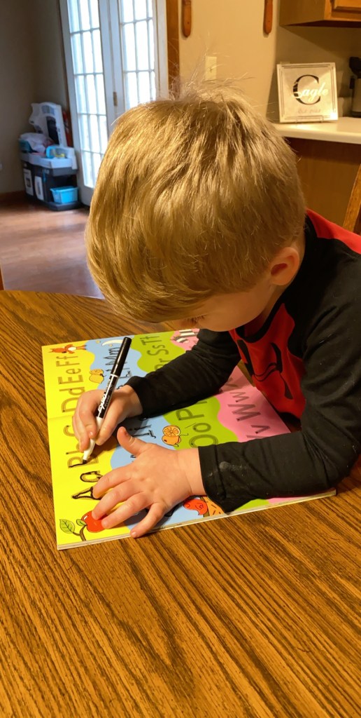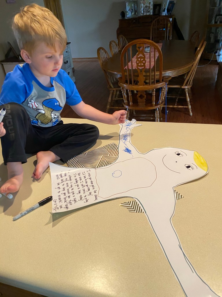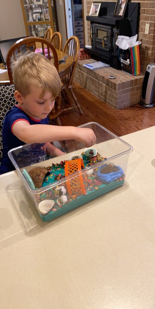 March 13th was my last regular day of work. The following week was deemed an early Spring Break, followed by the actual week of Spring Break and the following week started virtual learning for the remainder of the semester. These weeks were extremely trying as I was at home full time with Grant and learning how to teach from home. I survived on very little sleep. I found the easiest way to accomplish my work was to play with Grant all day and stay up into the wee hours of the morning working for school. We played outside nearly every single day. My typical school hours seemed to be about 6 pm to 3 am every day. We went approximately 6 weeks with very little interaction from anyone else including my parents. Eventually I had to ask for help and my mom started keeping Grant for me some. These were a very exhausting, mentally draining, and scary 6 weeks. While I am very very thankful for the time I was able to spend with Grant during those weeks, I quickly saw that I could not sustain this for much longer. Grant had virtual pre-school with lessons sent home by his teacher along with PBS AMI. To be completely honest however, we pretty much did our own thing. We did attempt some of the same pbs shows but his age category was pre-k to 2nd grade and much of the content was over his level of understanding. So we worked on anything I could turn in to education. Including “writing”his name with cotton balls, doing science experiments, playing with moon sand, etc.