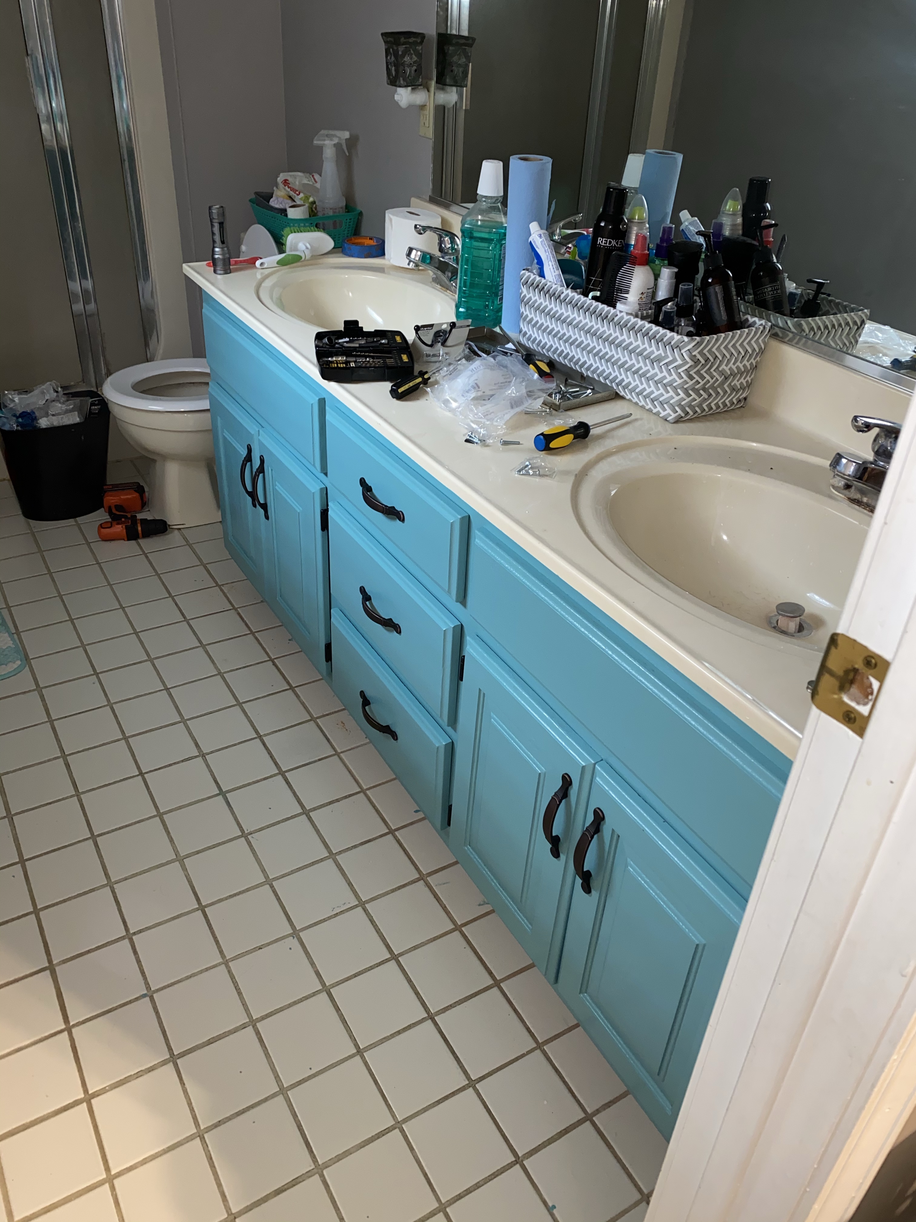 So during my “Spring Break” I decided that I wanted to redo our master bathroom! I did most of the work myself for it. With some help from friends as well. I painted the vanity, ripped up the awful old tile and replaced it with beautiful vinyl plank flooring, replaced the toilet, and light fixtures as well. I love the way it turned out.